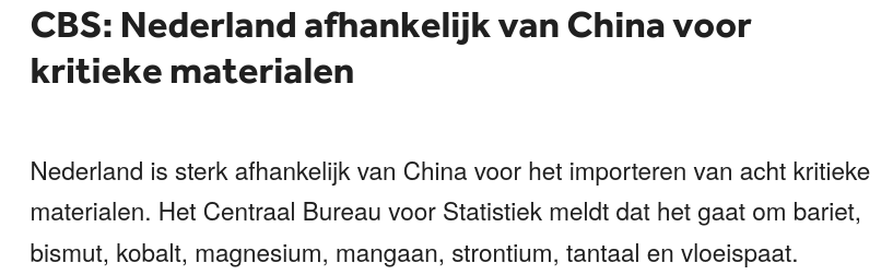 Blijkt ook dat veel grondstoffen geïmporteerd worden. Het is zaak dat Nederland minder afhankelijk wordt van andere landen, zeker van landen buiten de Europese Unie.